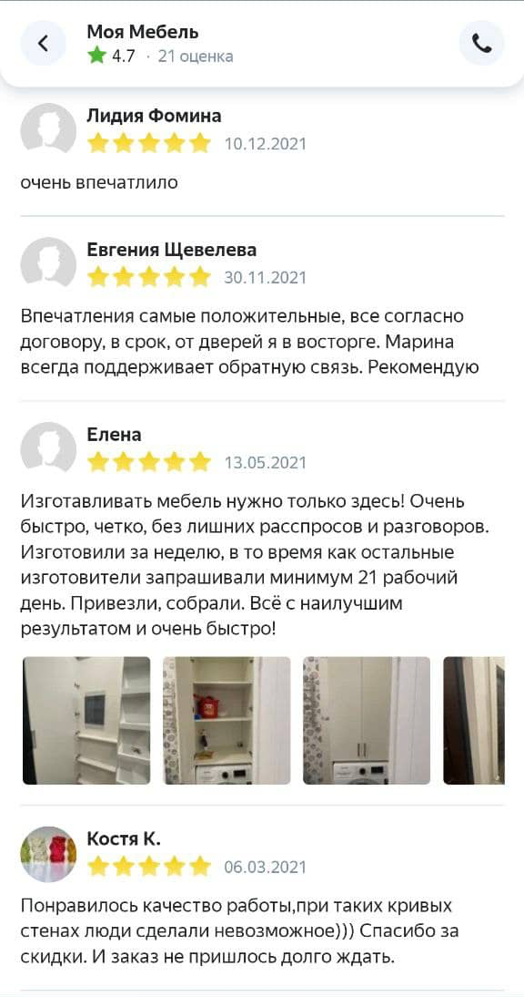 Меня зовут Марина и я уже более 15 лет работаю главным технологом на фабрике Моя Мебель. За это время мы выработали уникальную систему производства корпусной мебели без сколов и с минимальными допусками. Я с радостью помогу Вам подобрать мебель под любой интерьер и любых размеров. Наши курьеры поднимут изделие на Ваш этаж, даже если лифт не работает, а сборщики установят все за один день, без пыли и мусора.
